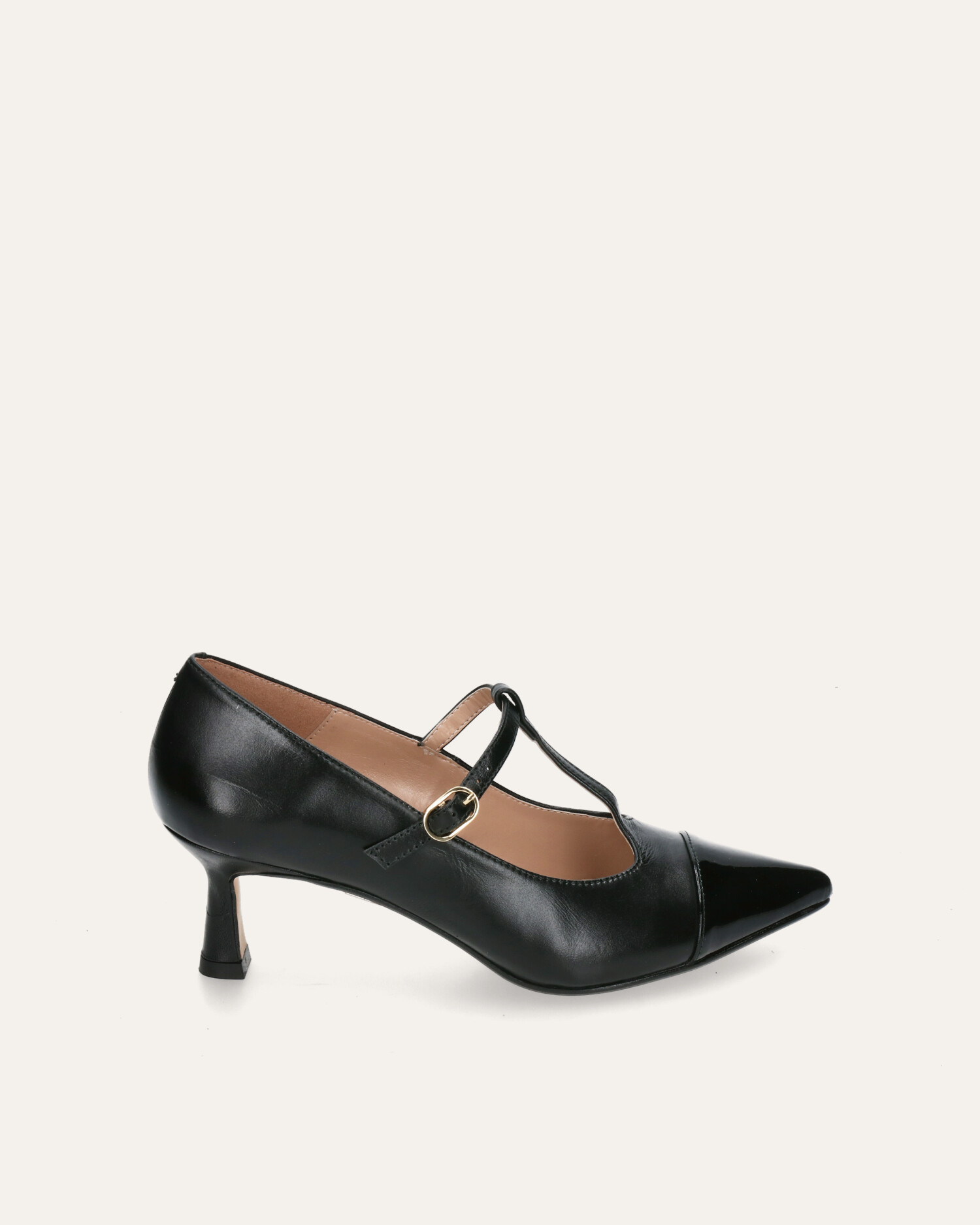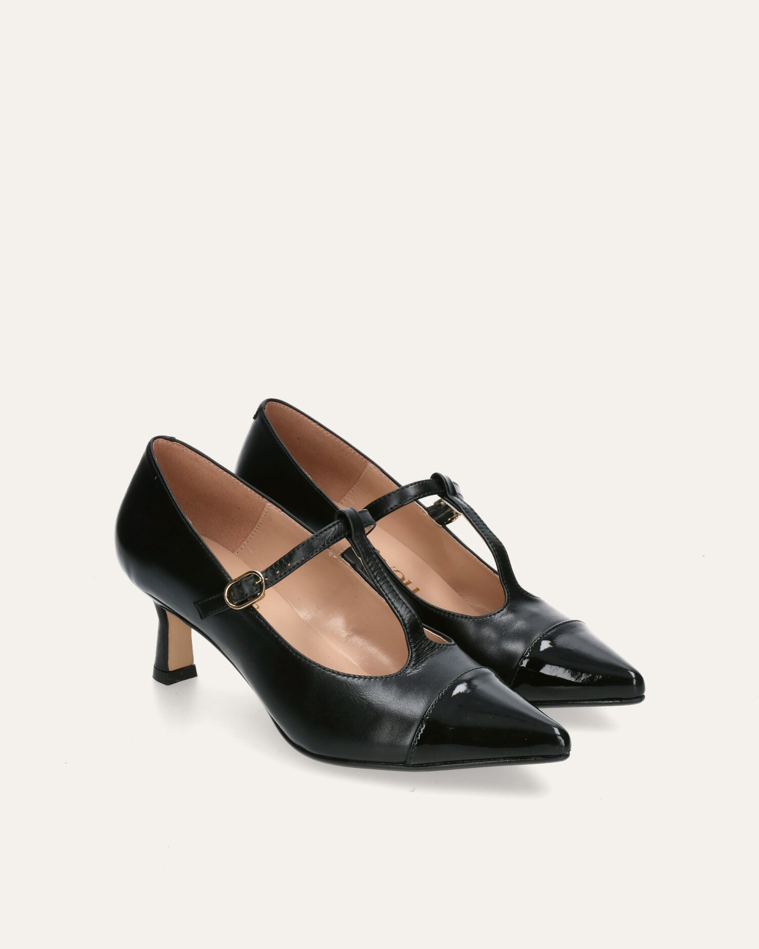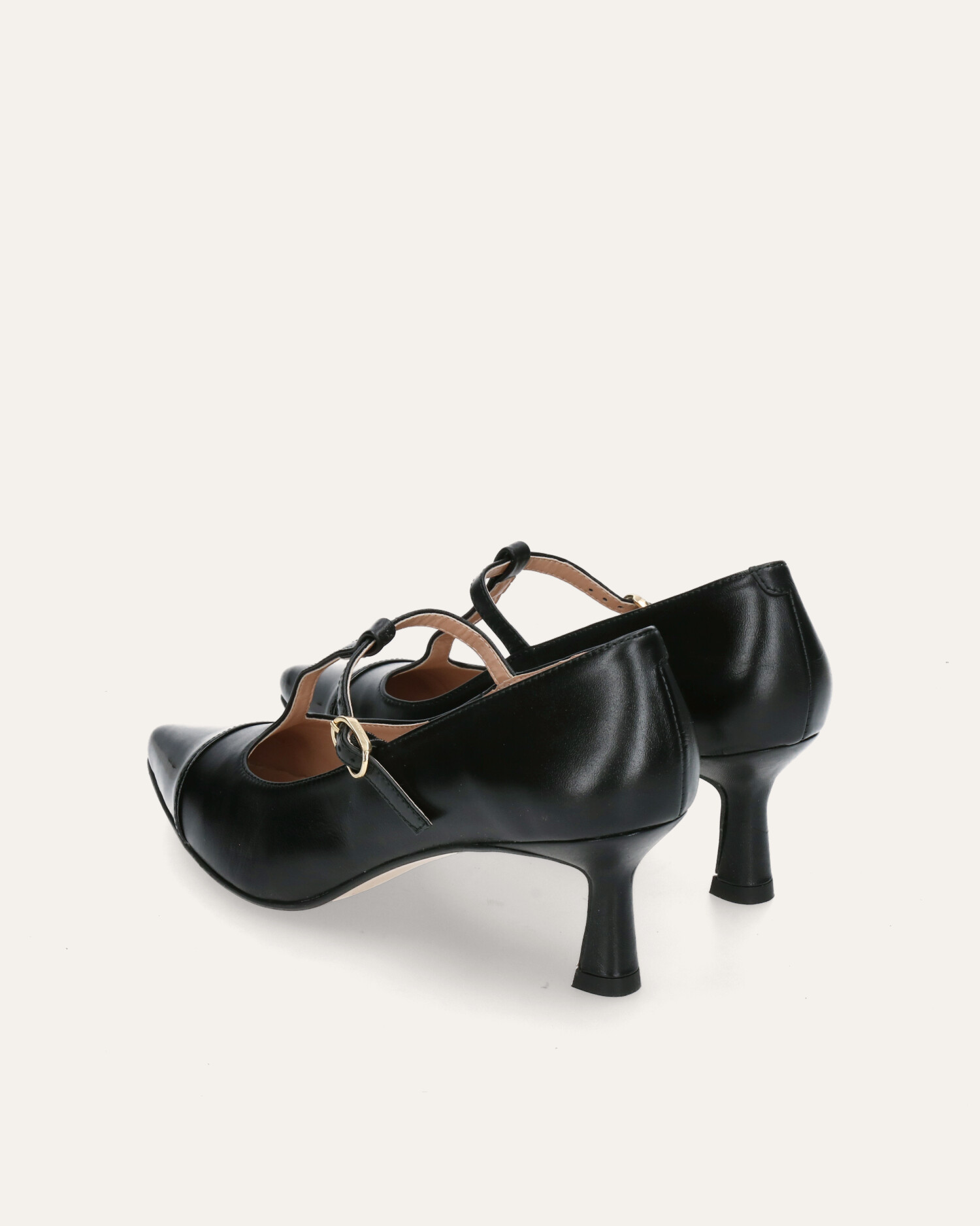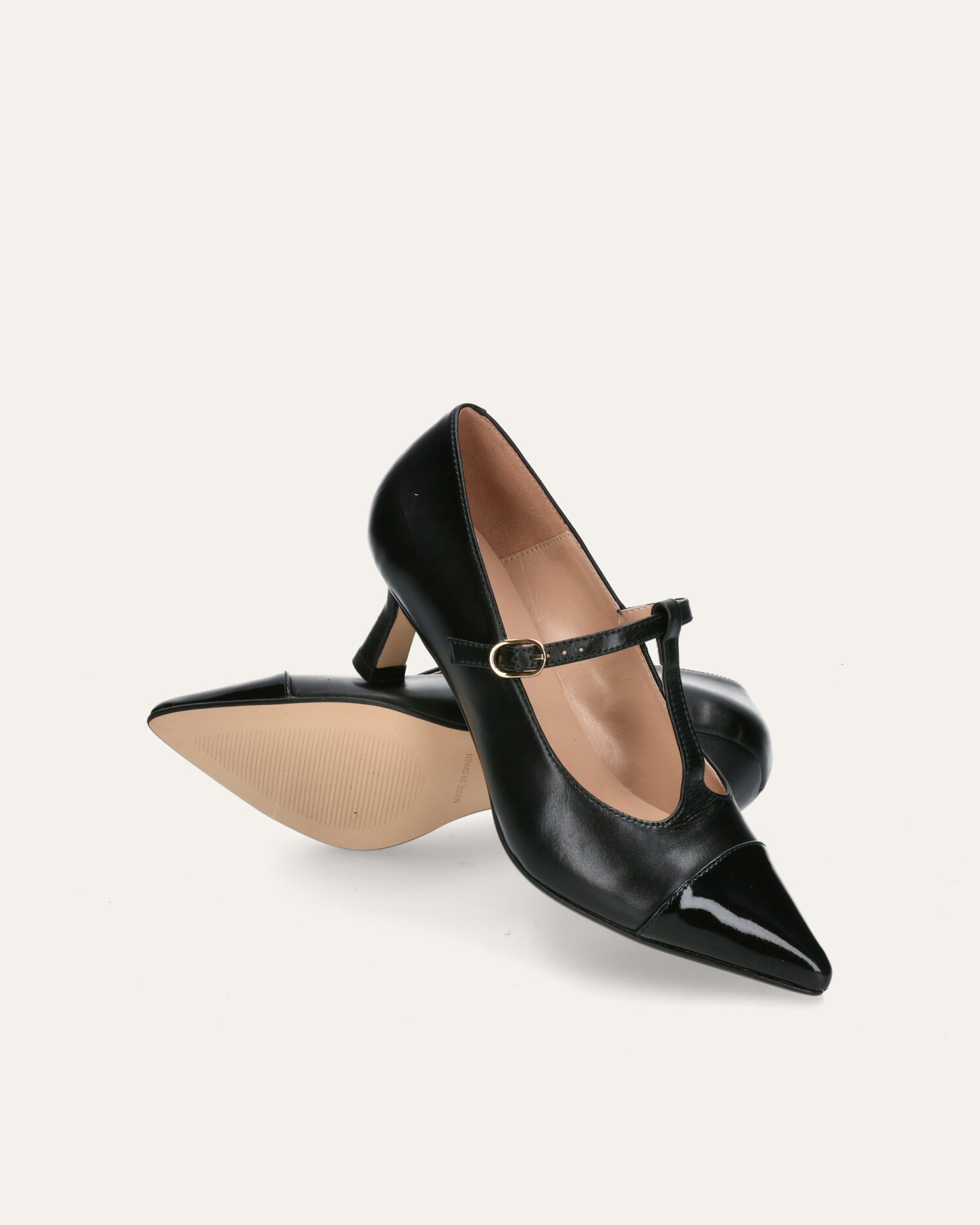 • Mary-jane-style heels made of soft black leather with a black patent toe cap.