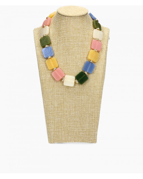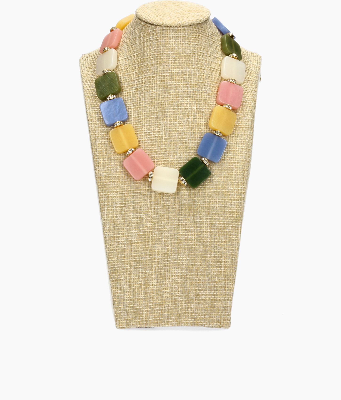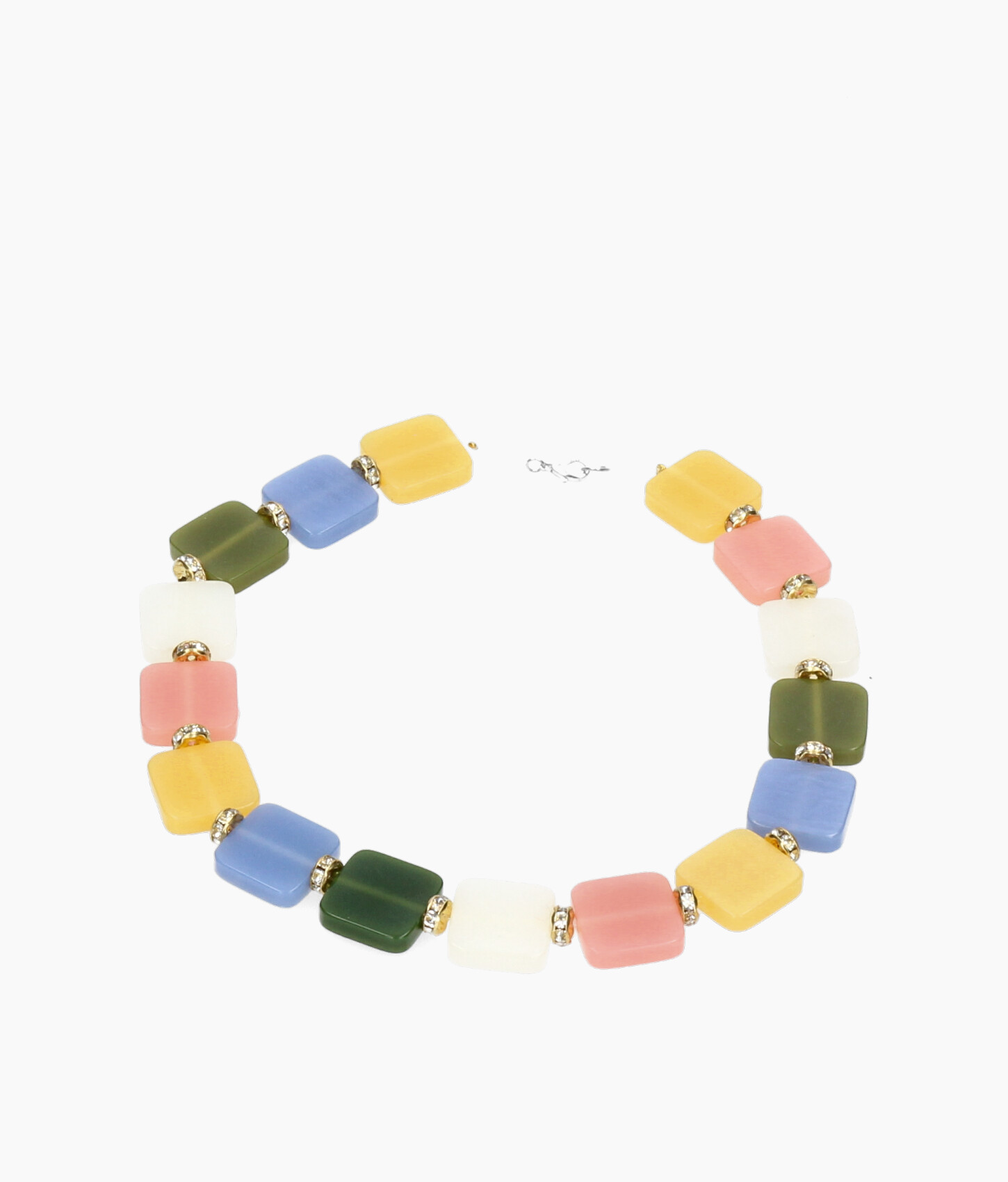 • Necklace with square pieces of natural-colored resin and rhinestones, designed by Blanca PCR.