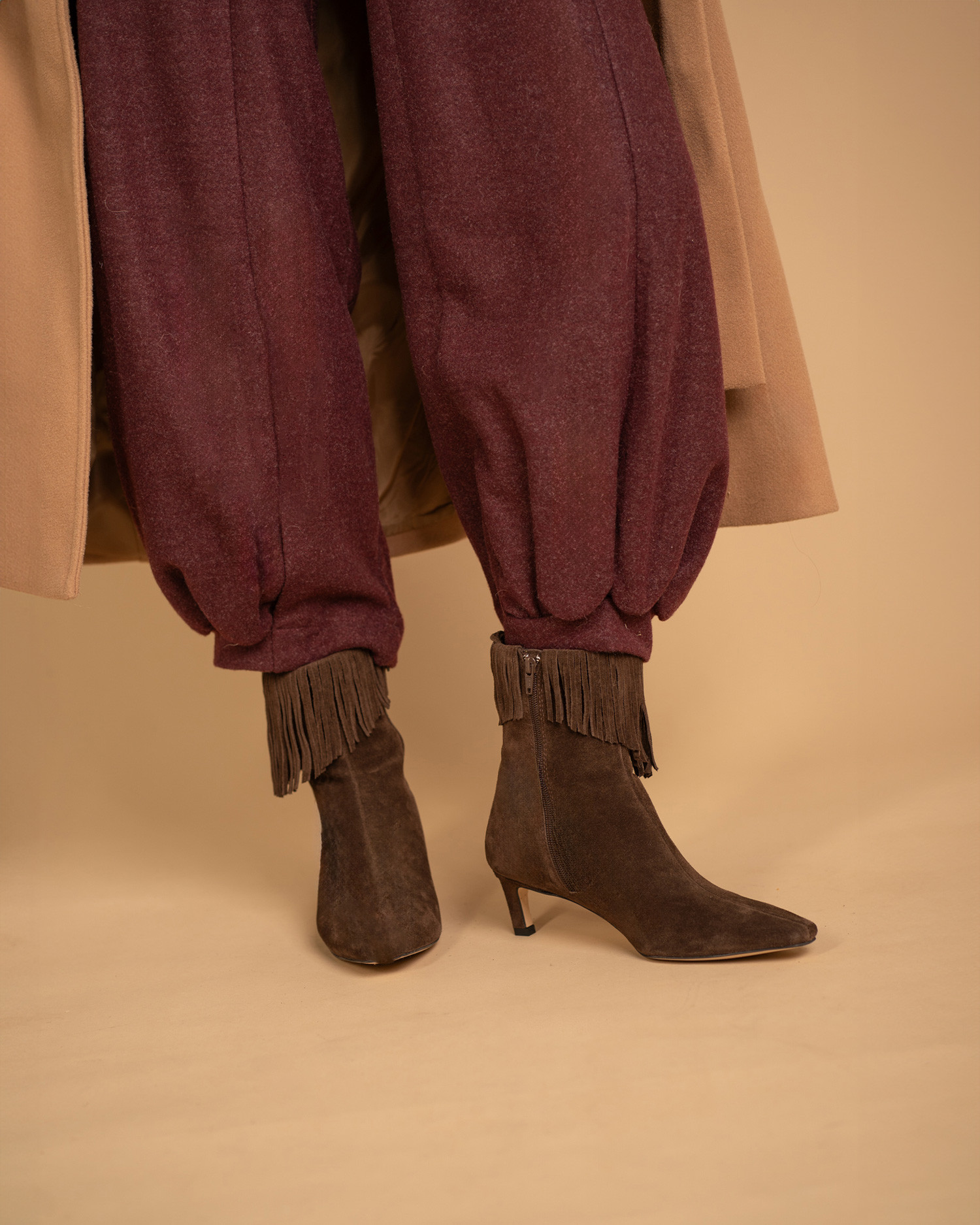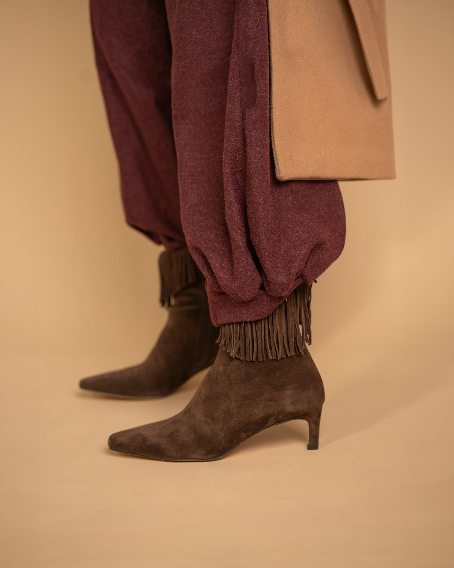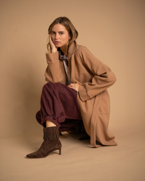 • Western-inspired heeled ankle boot made of brown suede.