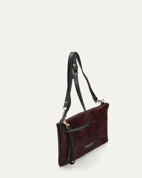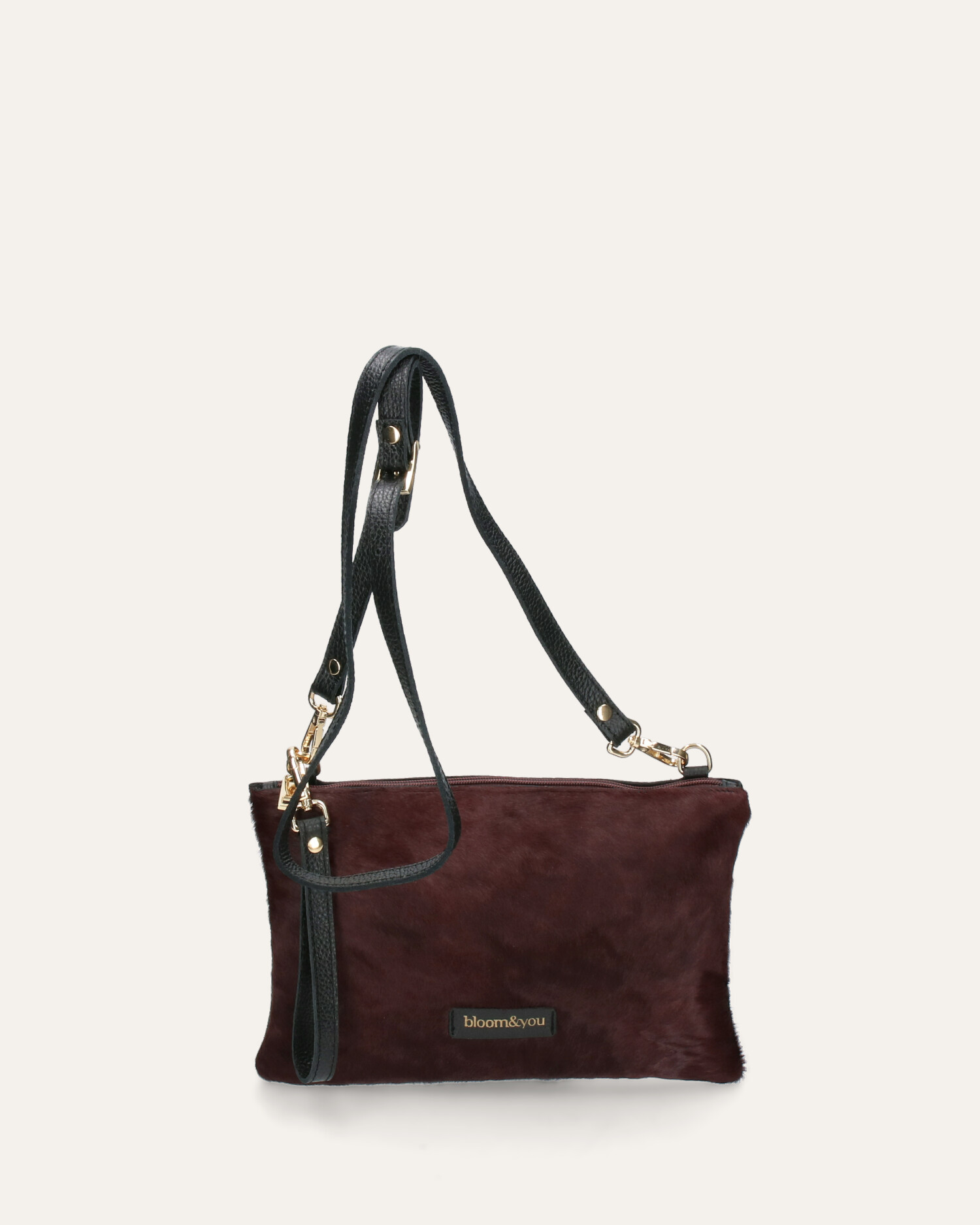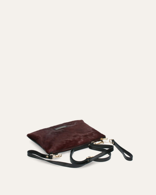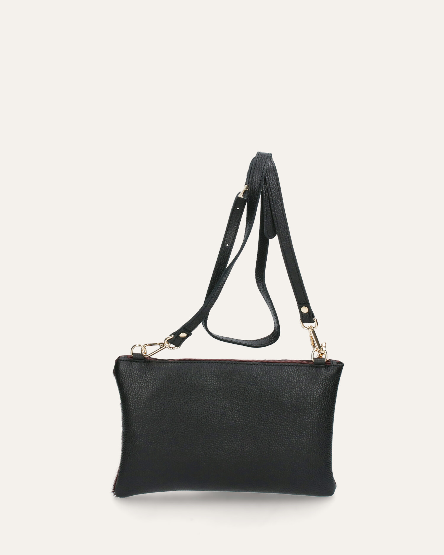 • Bolso confeccionado en piel con pelo burdeos en la parte delantera y piel negra en la parte trasera.