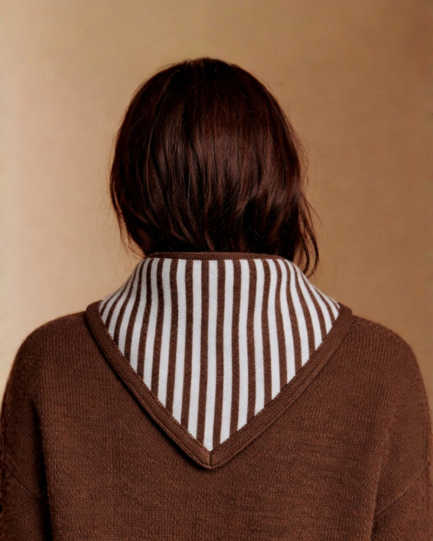 - Bandana con forma triangular y dibujo de rayas verticales en marrón y azul.