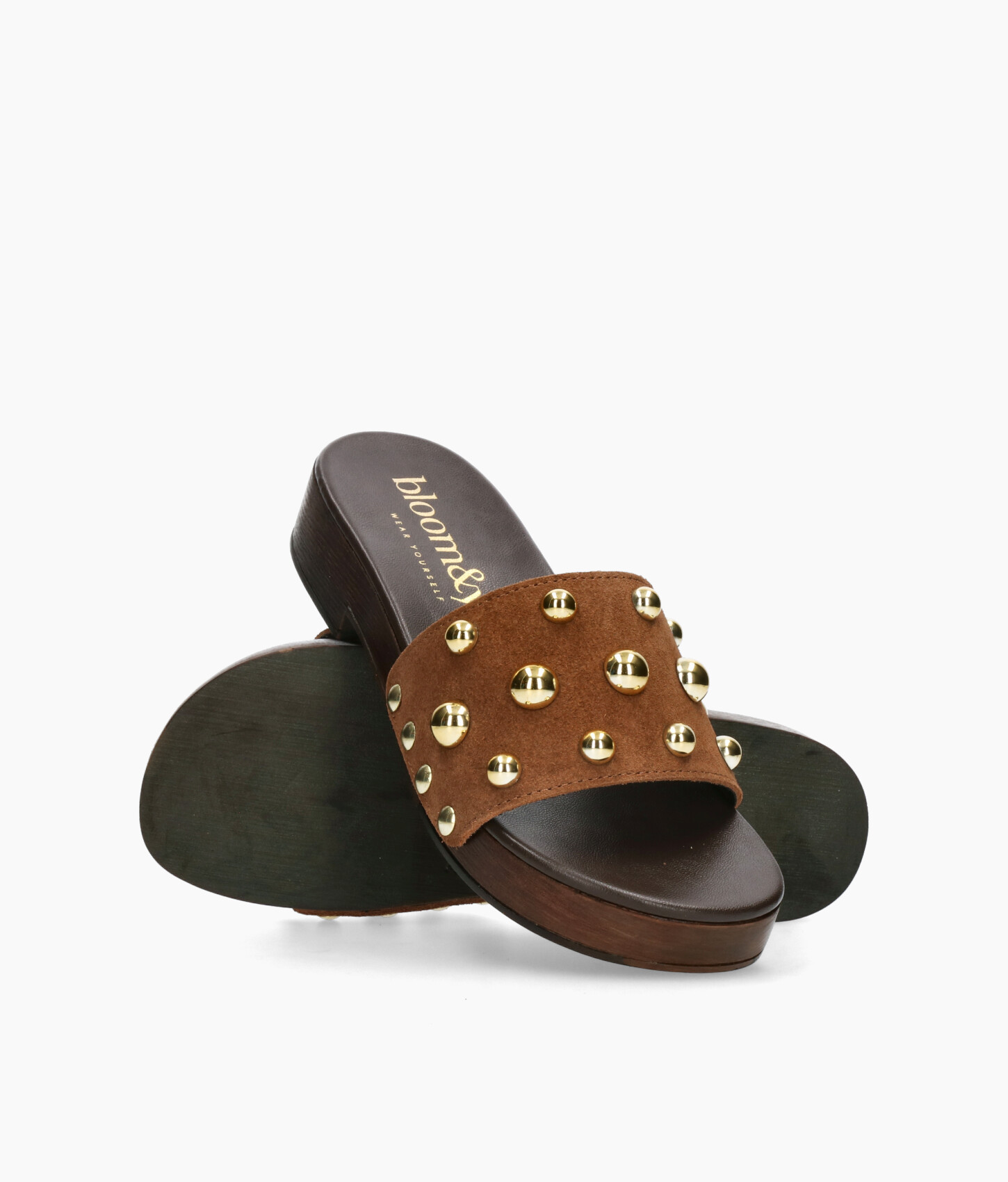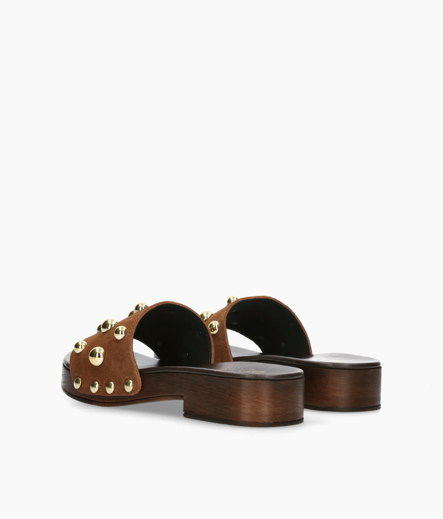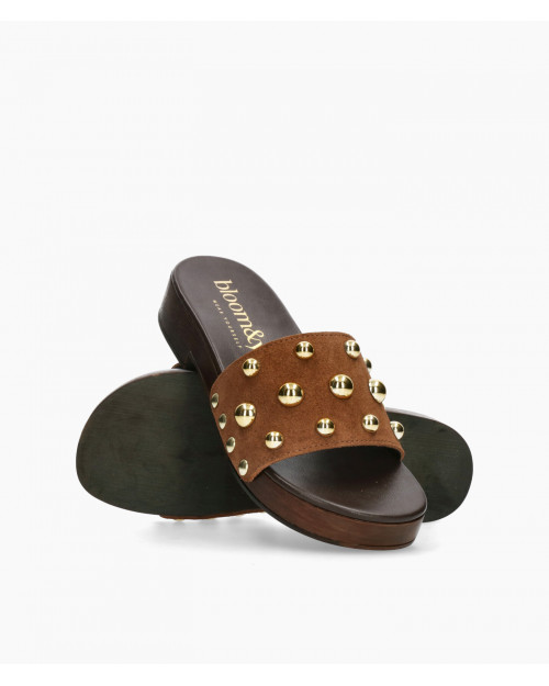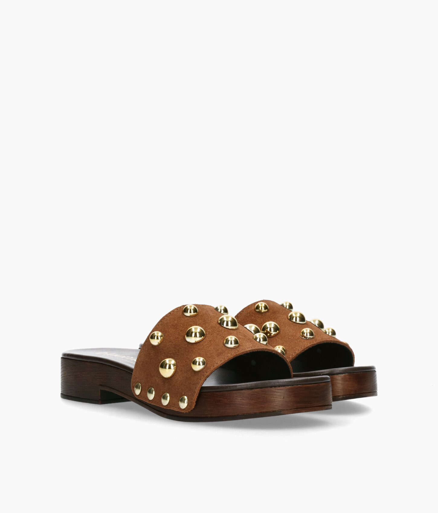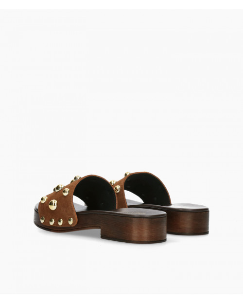• Sandalia estilo zueco con piso efecto madera y exterior de serraje color cuero.