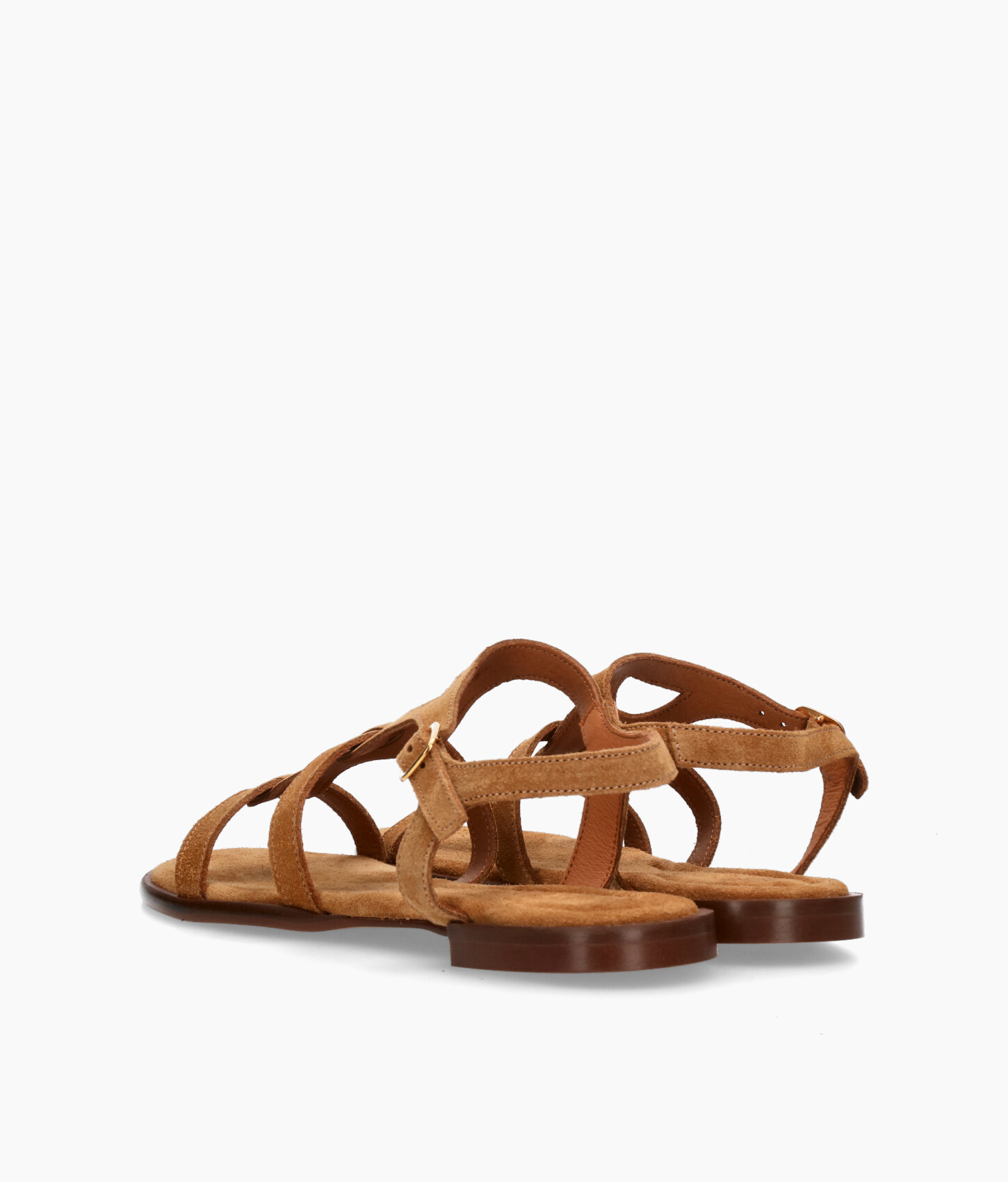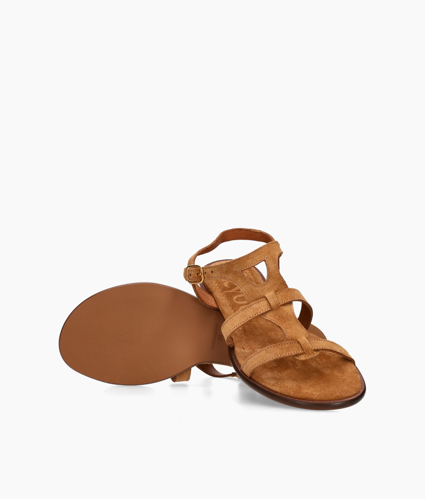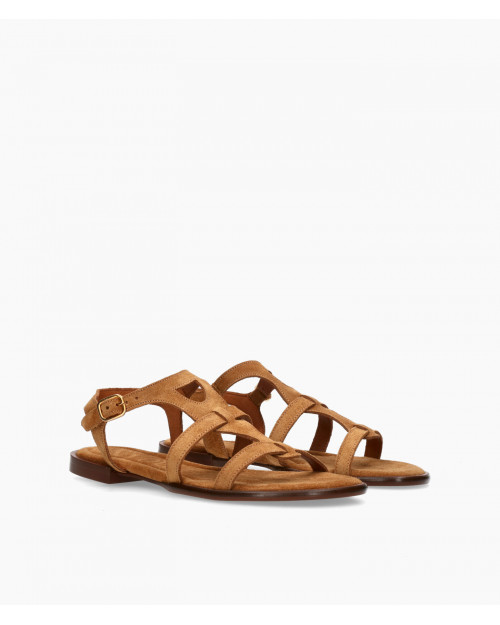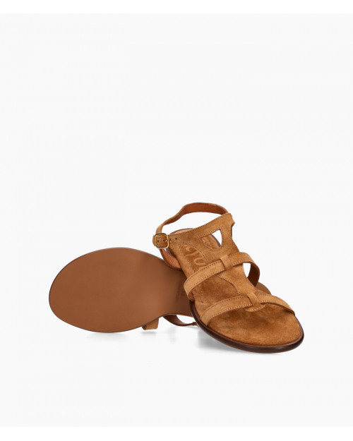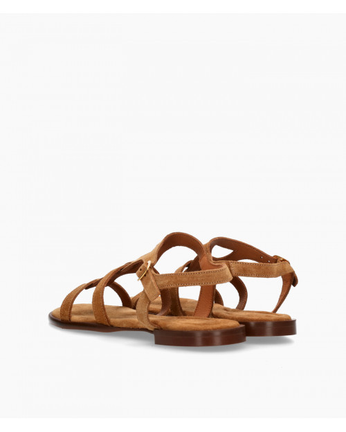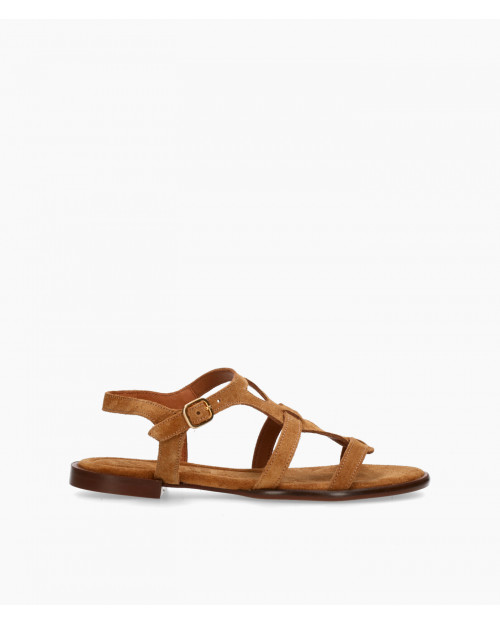 • Sandalia estilo romana fabricada en suave serraje color cuero.