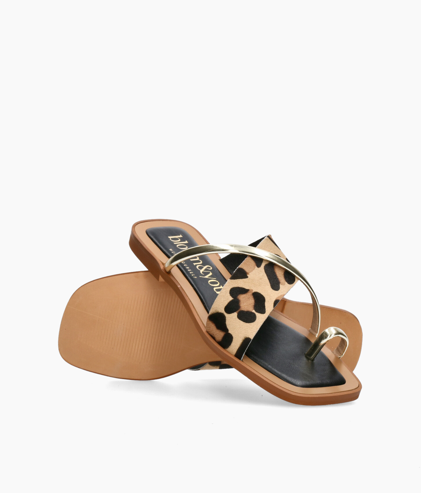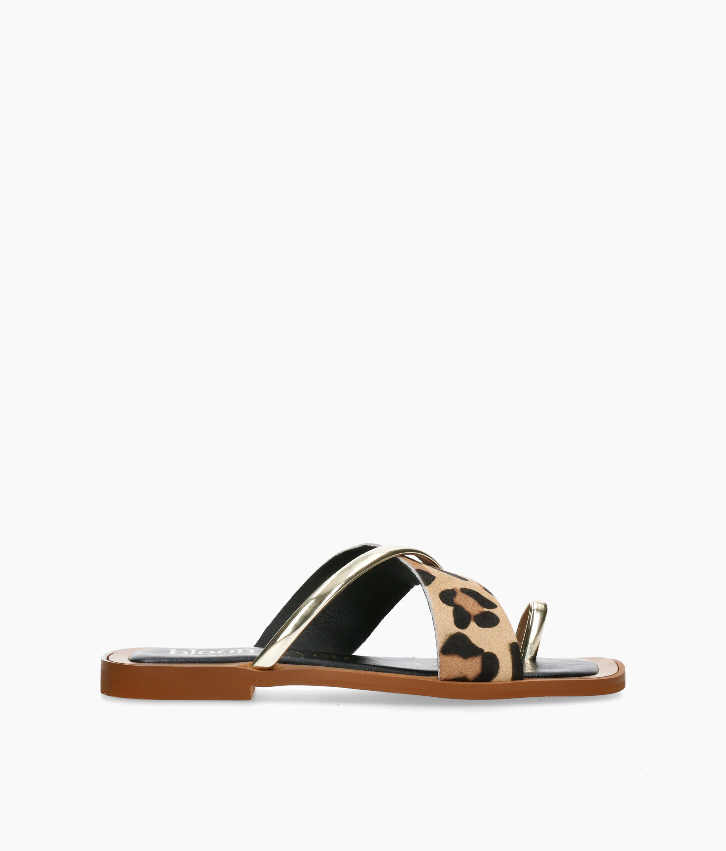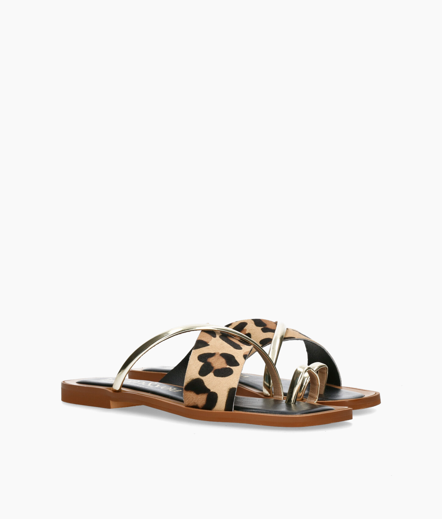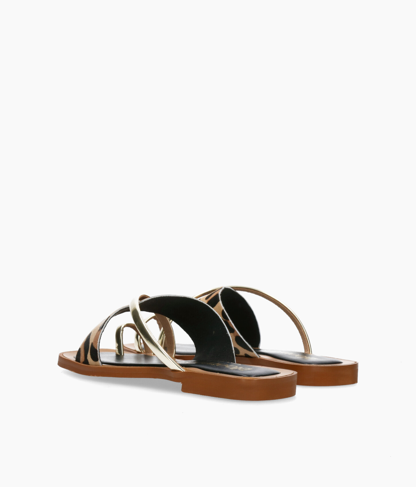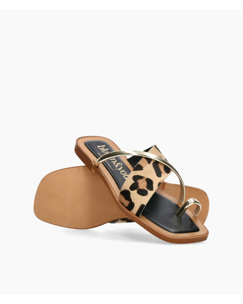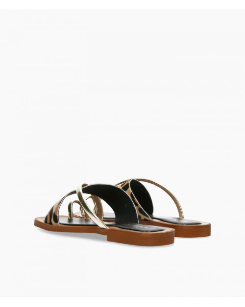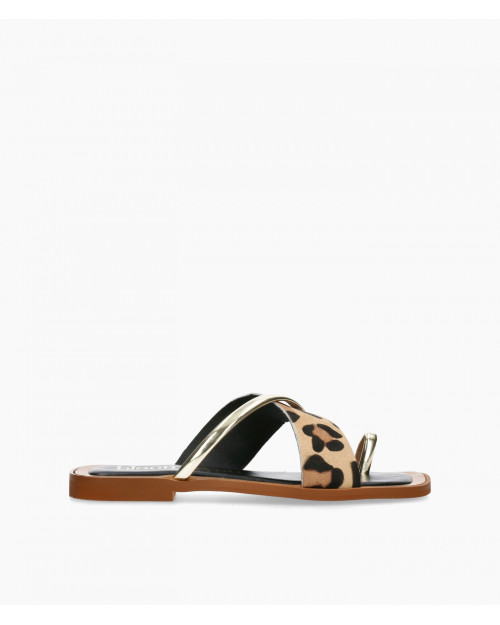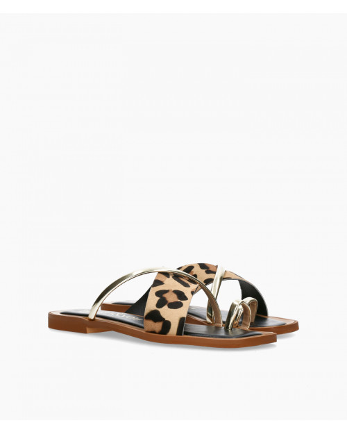 • Sandalia plana fabricada en suave piel serraje con print leopardo y piel metalizada.
