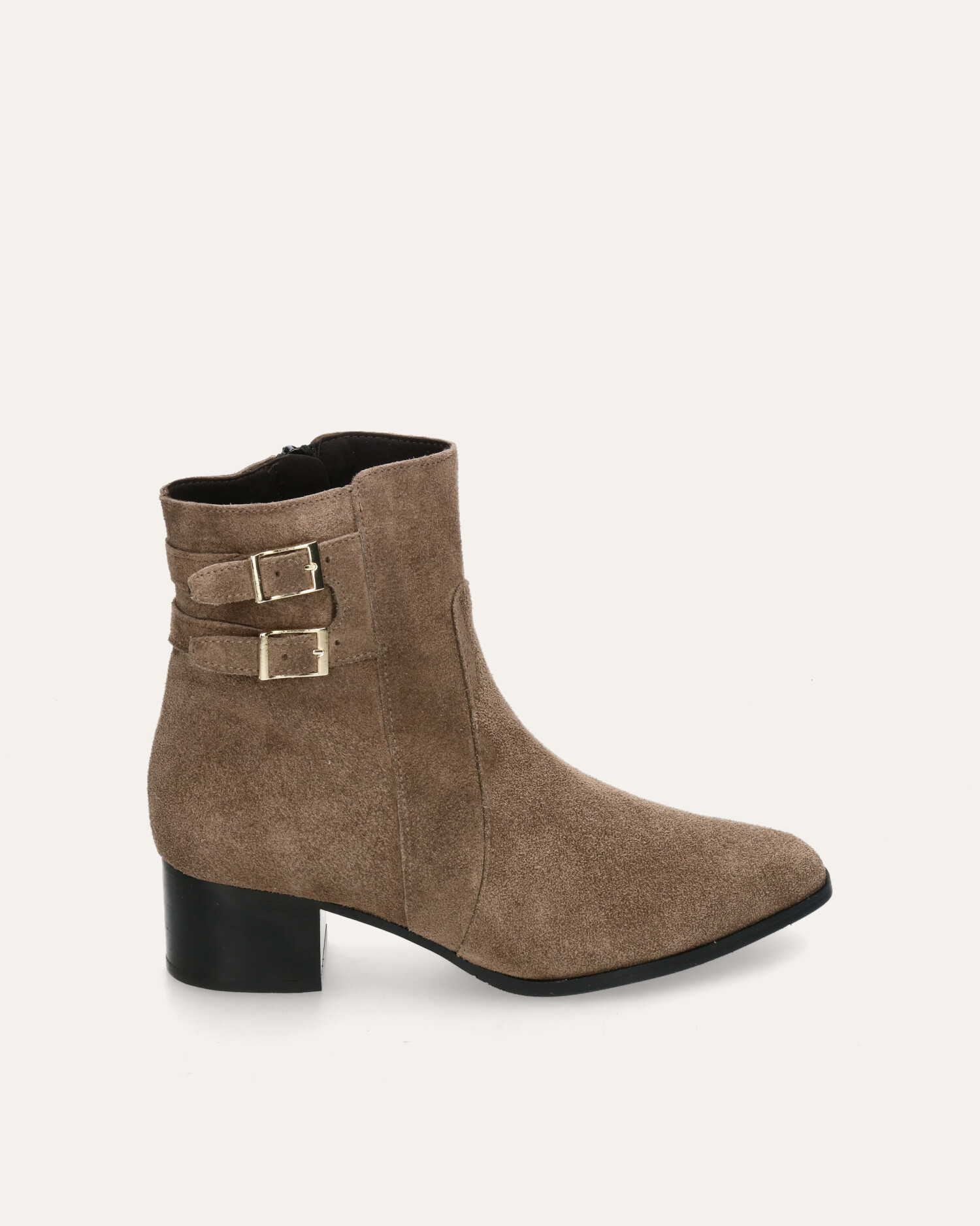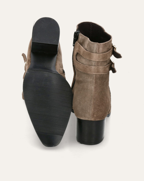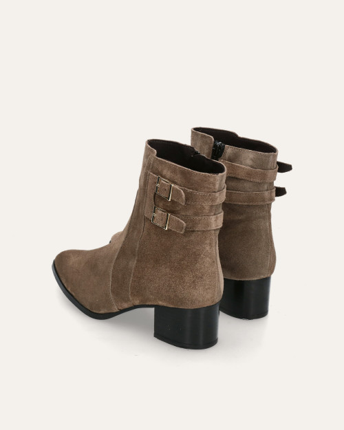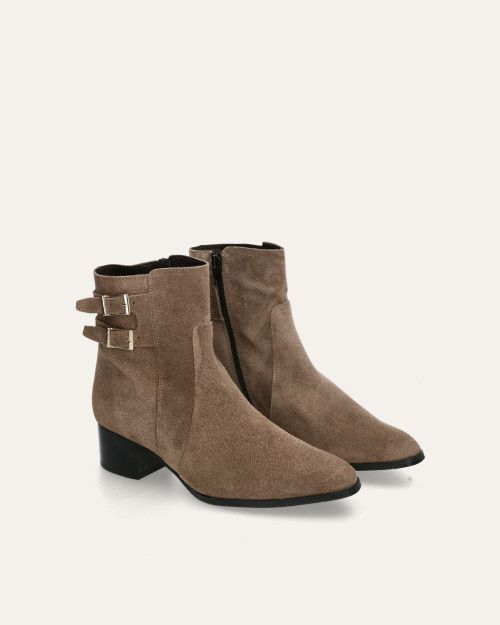 • Botín de tacón fabricado en piel serraje color taupe.