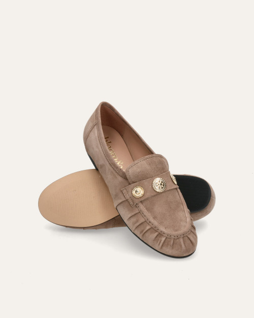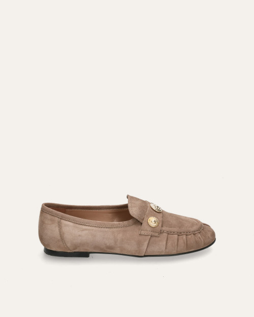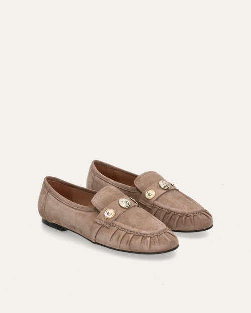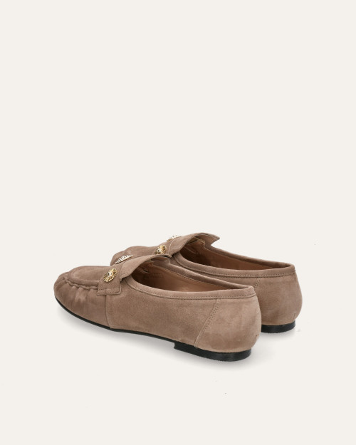 • Mocasín estilo kiowa fabricado en suave ante color taupe.